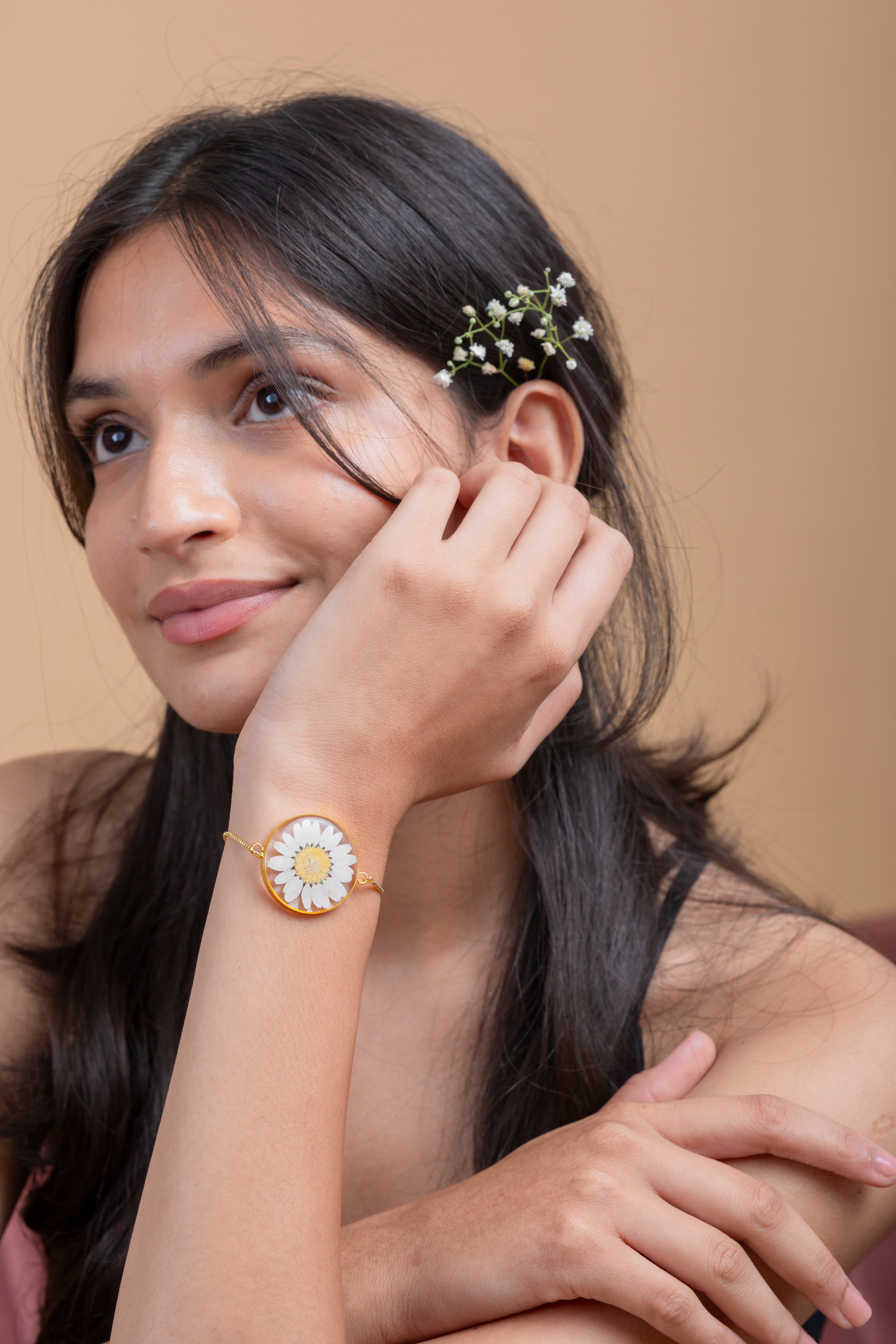 In the heart of every daisy lies a world of pure beauty. The Darling Daisy Bracelet showcases this delicate flower, preserved in resin, so its charm can blossom forever.