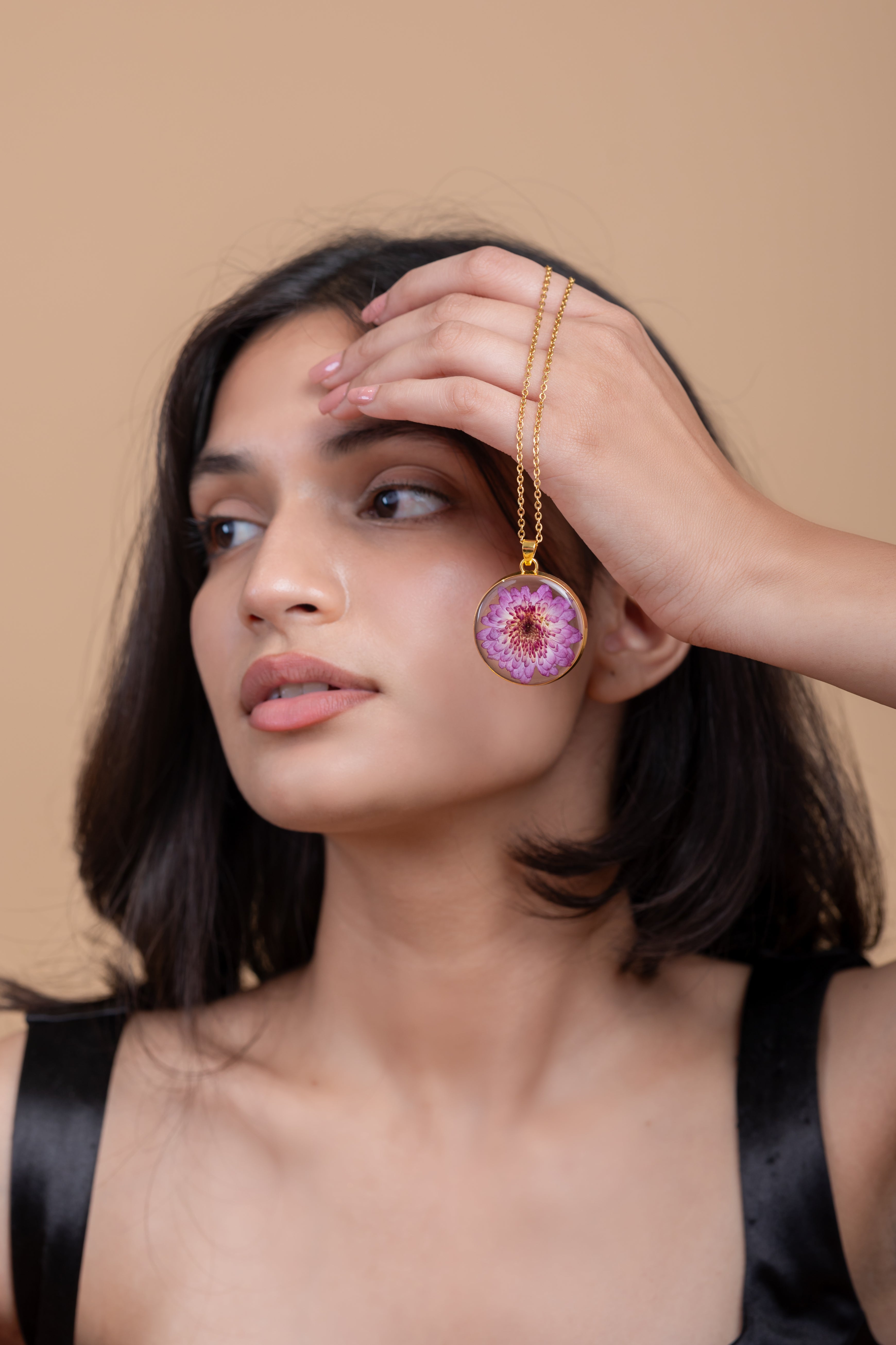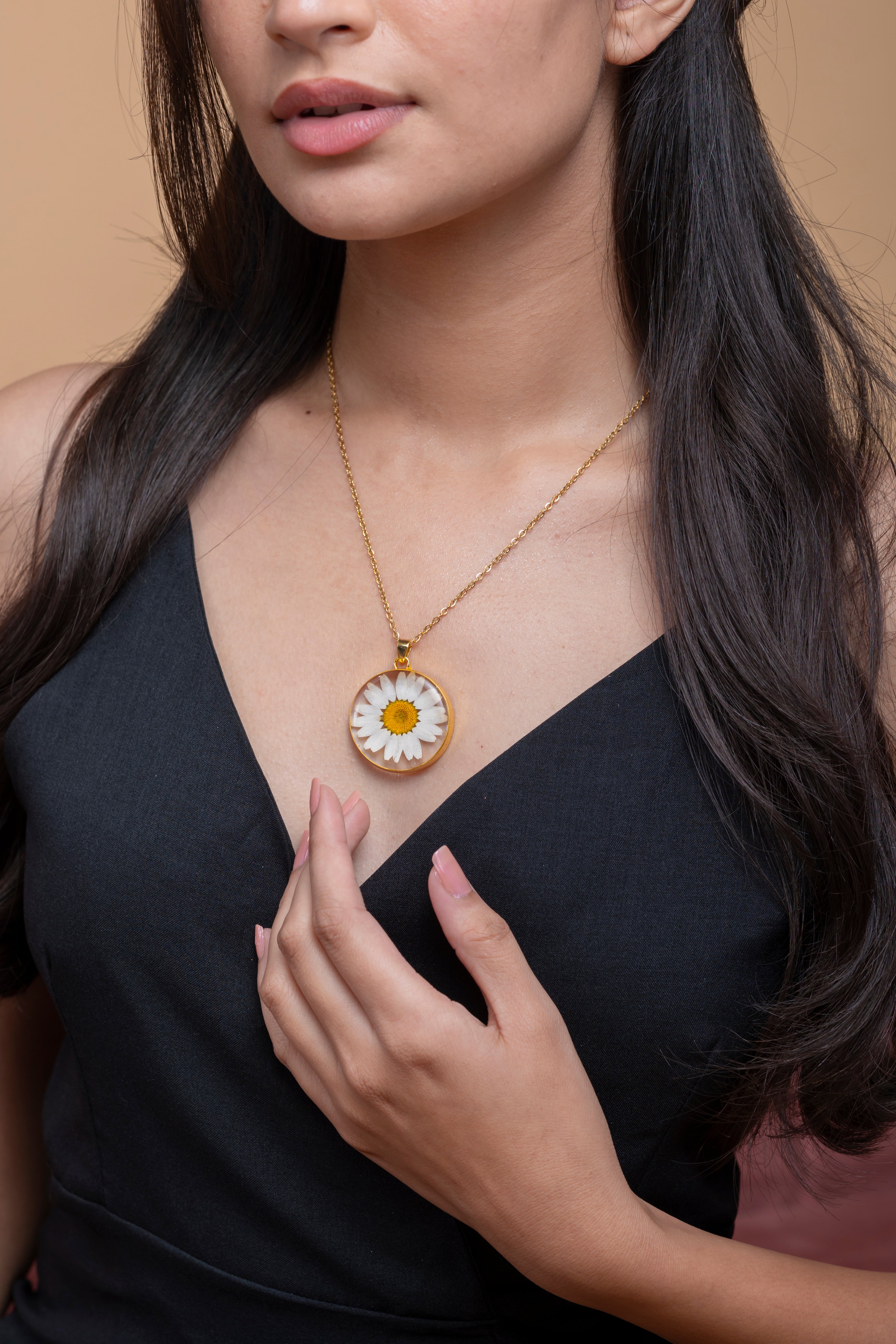 Daisy flowers symbolise new beginnings, cheerfulness, beauty, purity, innocence, hope, fun and affection. We preserve these golden eyed flowers to create stunning luxe gold necklaces.