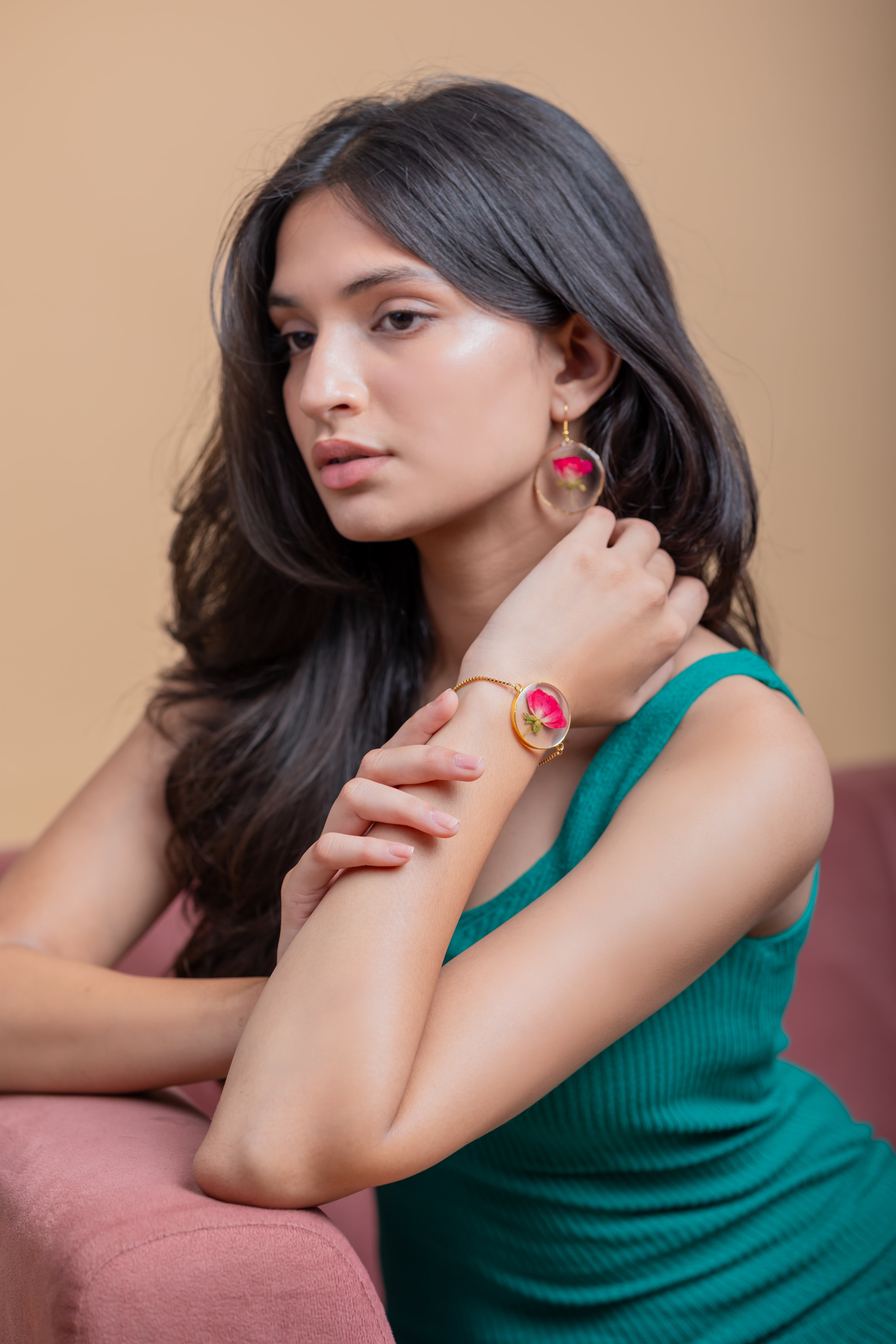 As the red rose symbolizes romance, courage, and respect, this bracelet immortalizes the flower’s meaning in a delicate resin setting, allowing its beauty and sentiment to last forever