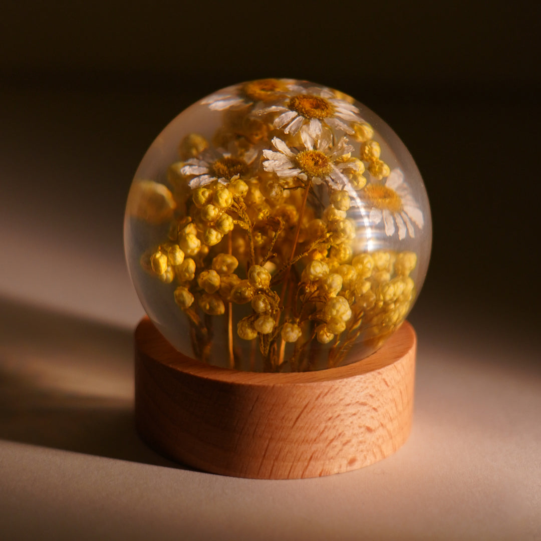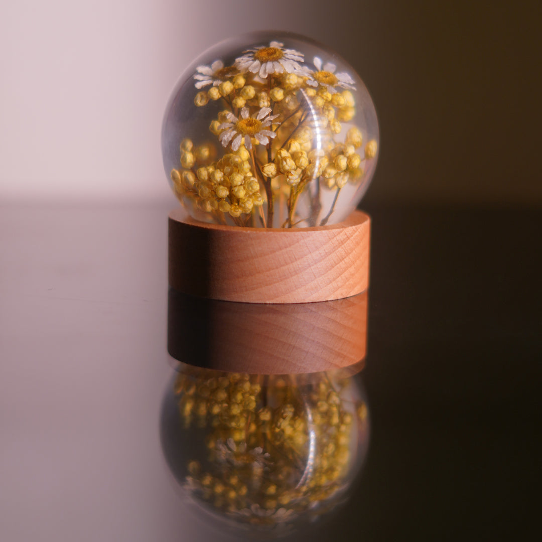 Resting on a wooden stand, this floral orb doesn’t just sit in a space—