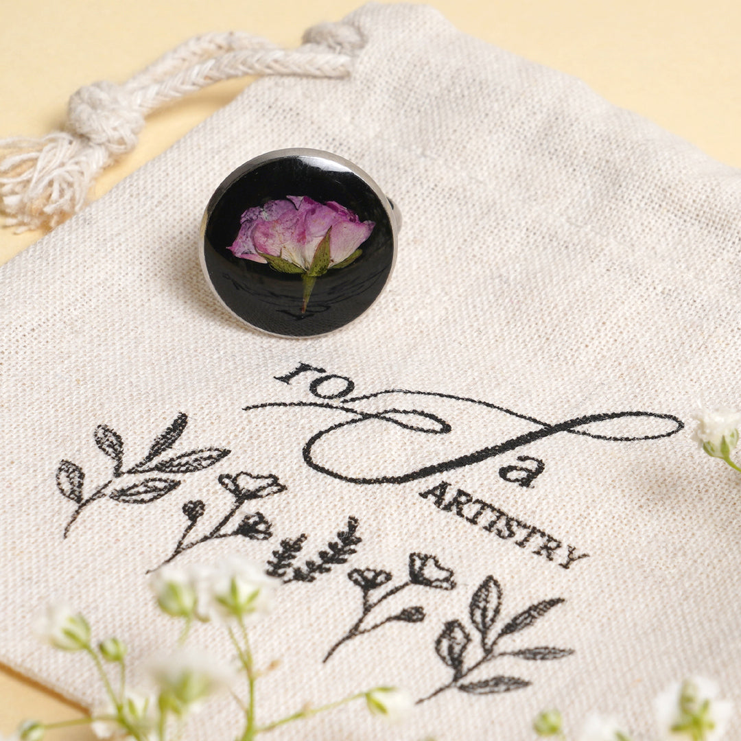 “Embrace timeless beauty with this exquisite ring featuring a preserved pink rose encased in clear resin.