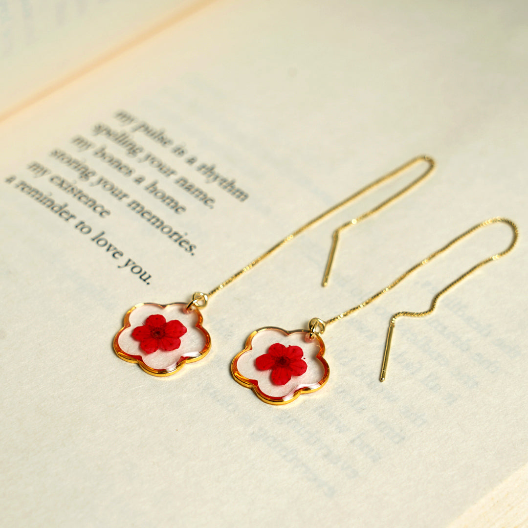 The Velvet Blossom Earrings hold a real preserved plum blossom,